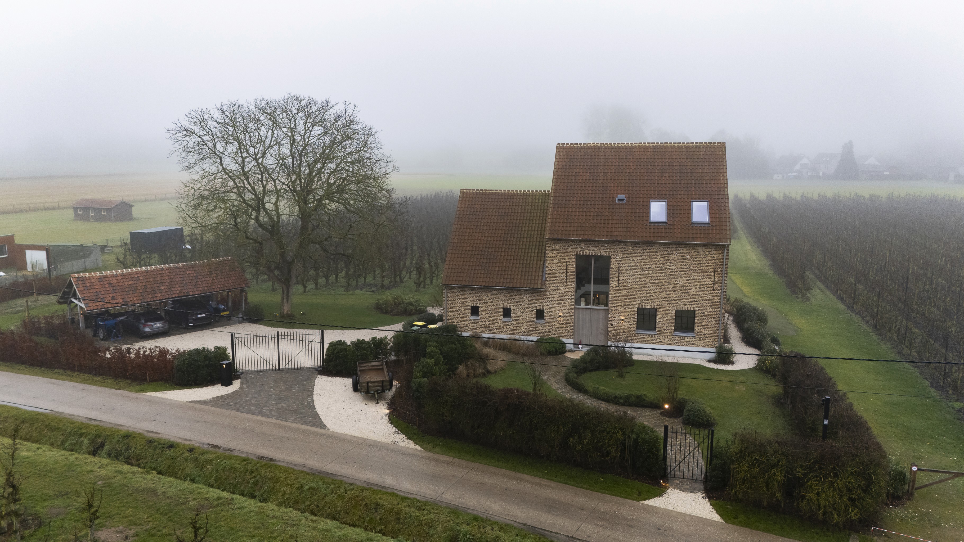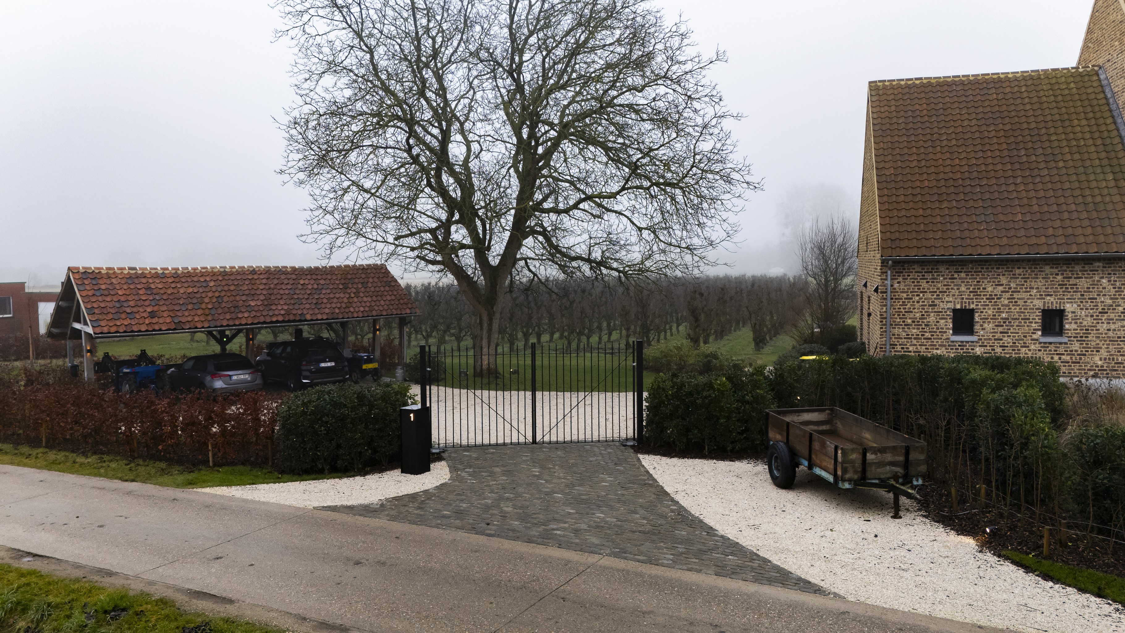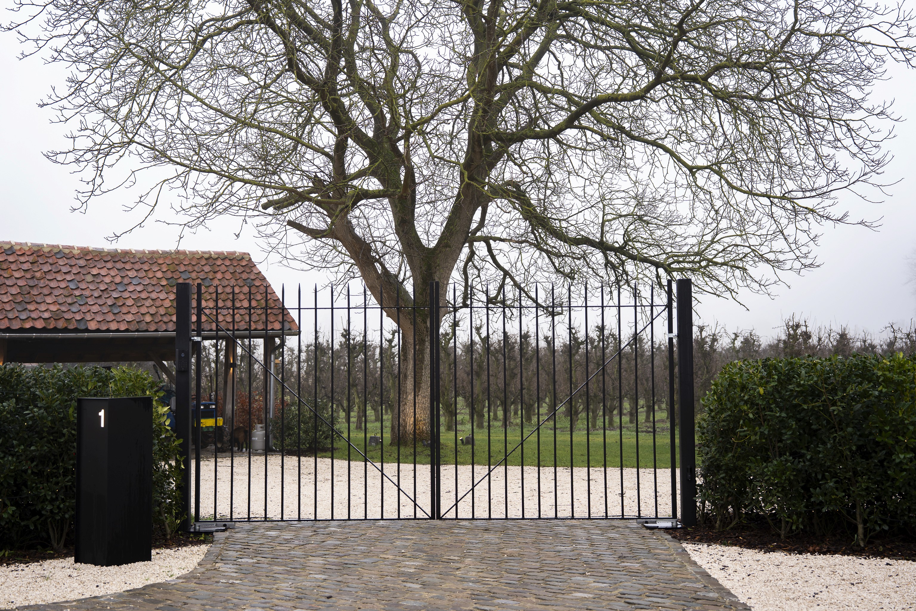 Het project in één oogopslag Voor deze karaktervolle hoevewoning was de vraag helder: een poort die beveiligt zonder te domineren, en die het landelijke karakter versterkt zonder nostalgisch te worden. De omgeving is open, groen en ritmisch opgebouwd. Dat vroeg om een ontwerp dat structuur brengt, niet om aandacht schreeuwt, maar wel duidelijk aanwezig is.