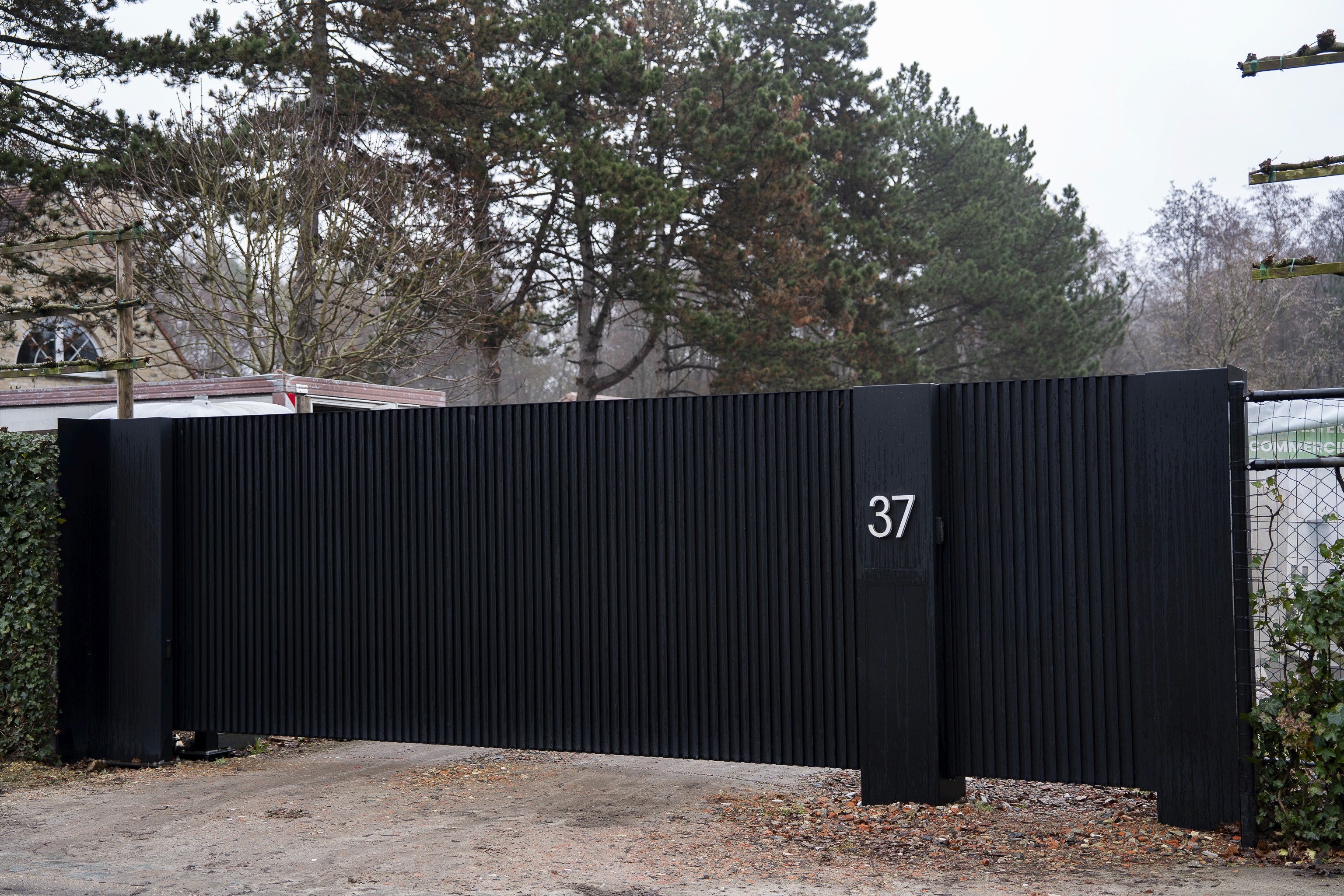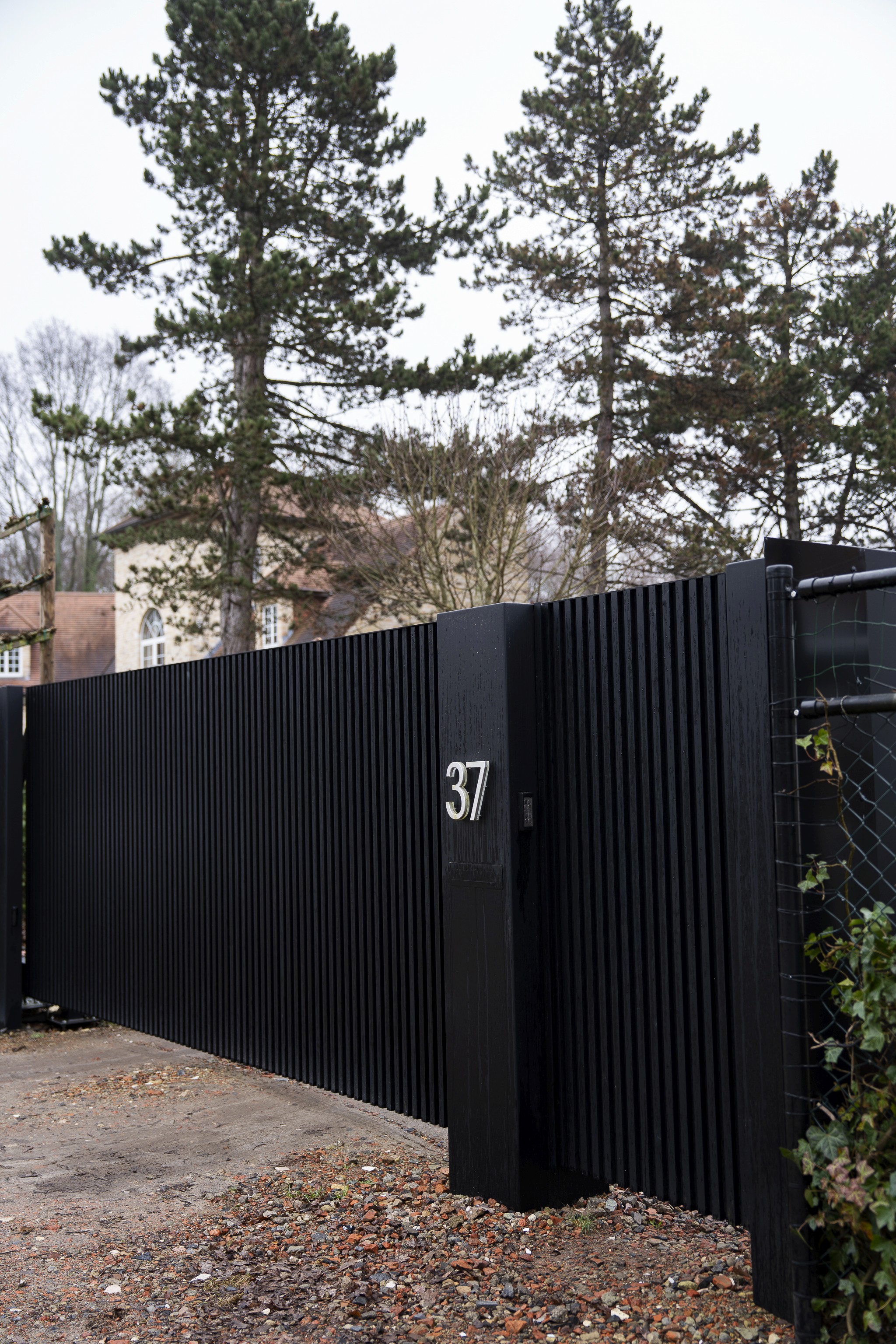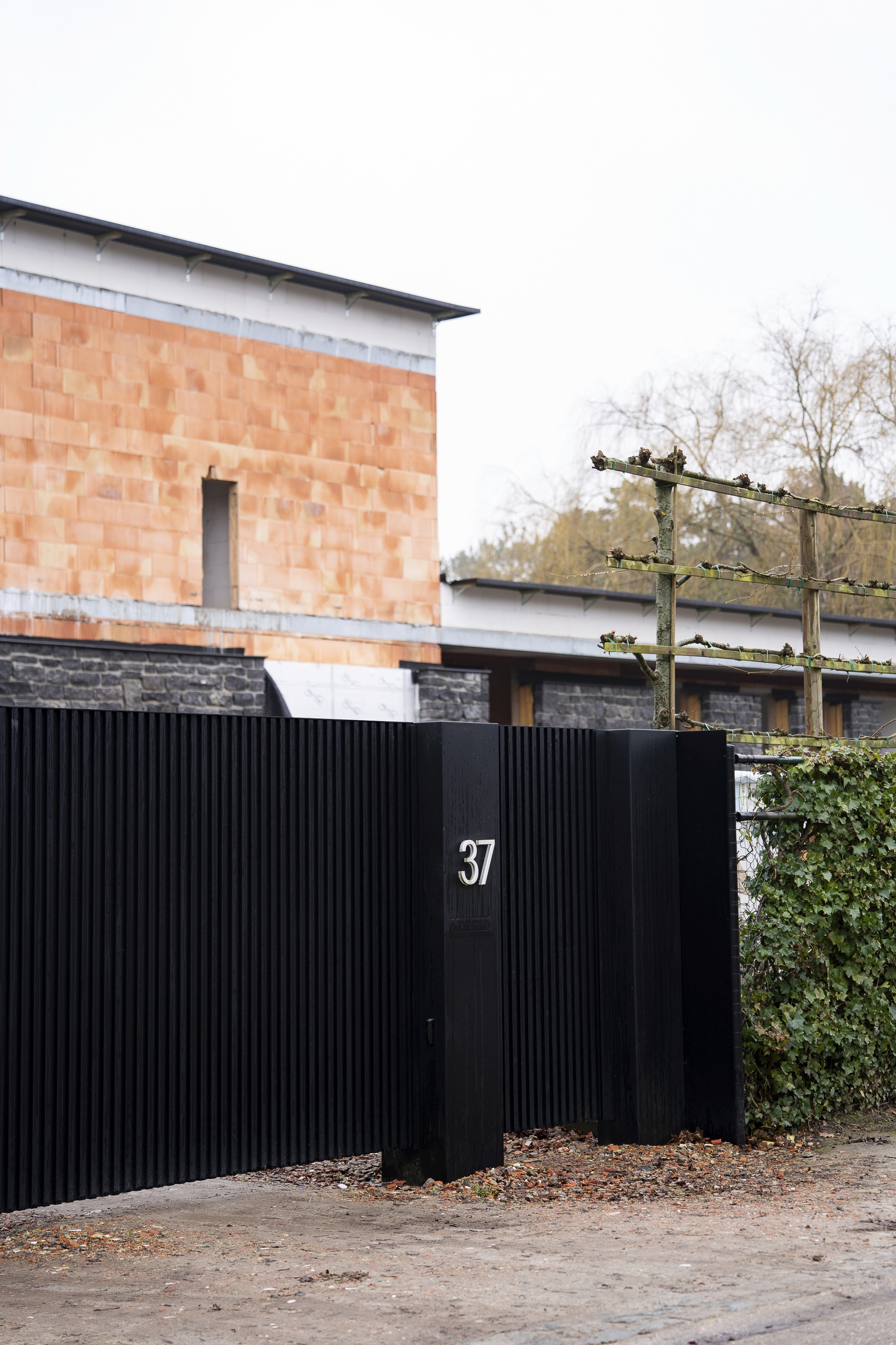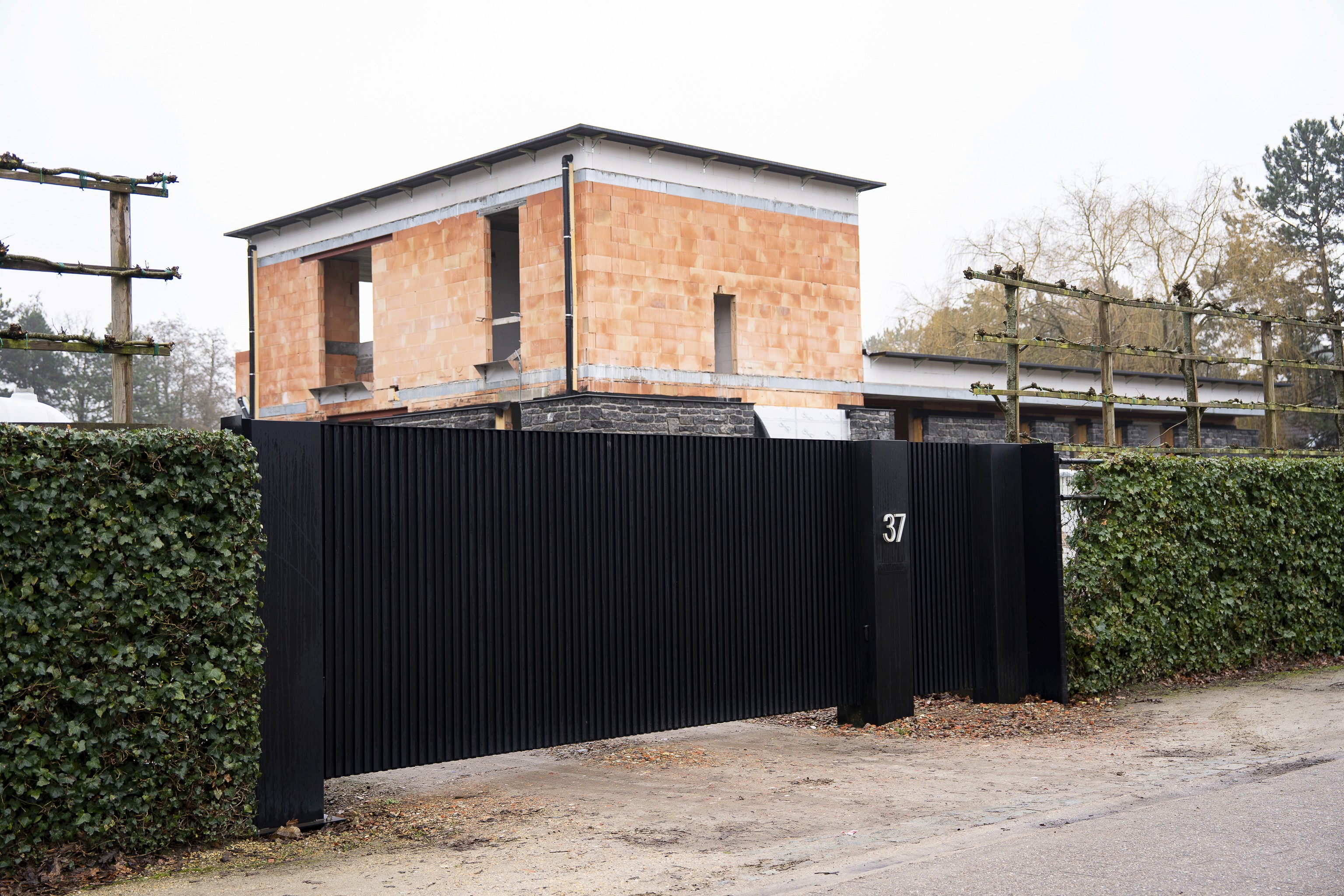 Voor deze woning in een groene, bosrijke omgeving kozen we voor een volledig op maat gemaakte aluminium schuifpoort in een warme kleur. De verticale belijning zorgt voor een subtiele structuur zonder het landelijke karakter van de woning te verstoren. De poort werd strak geïntegreerd tussen gemetste pijlers met ingebouwde videofoon, brievenbus en huisnummer. Alles werd technisch voorbereid en afgewerkt in één lijn, zodat functionaliteit en esthetiek perfect samenkomen.