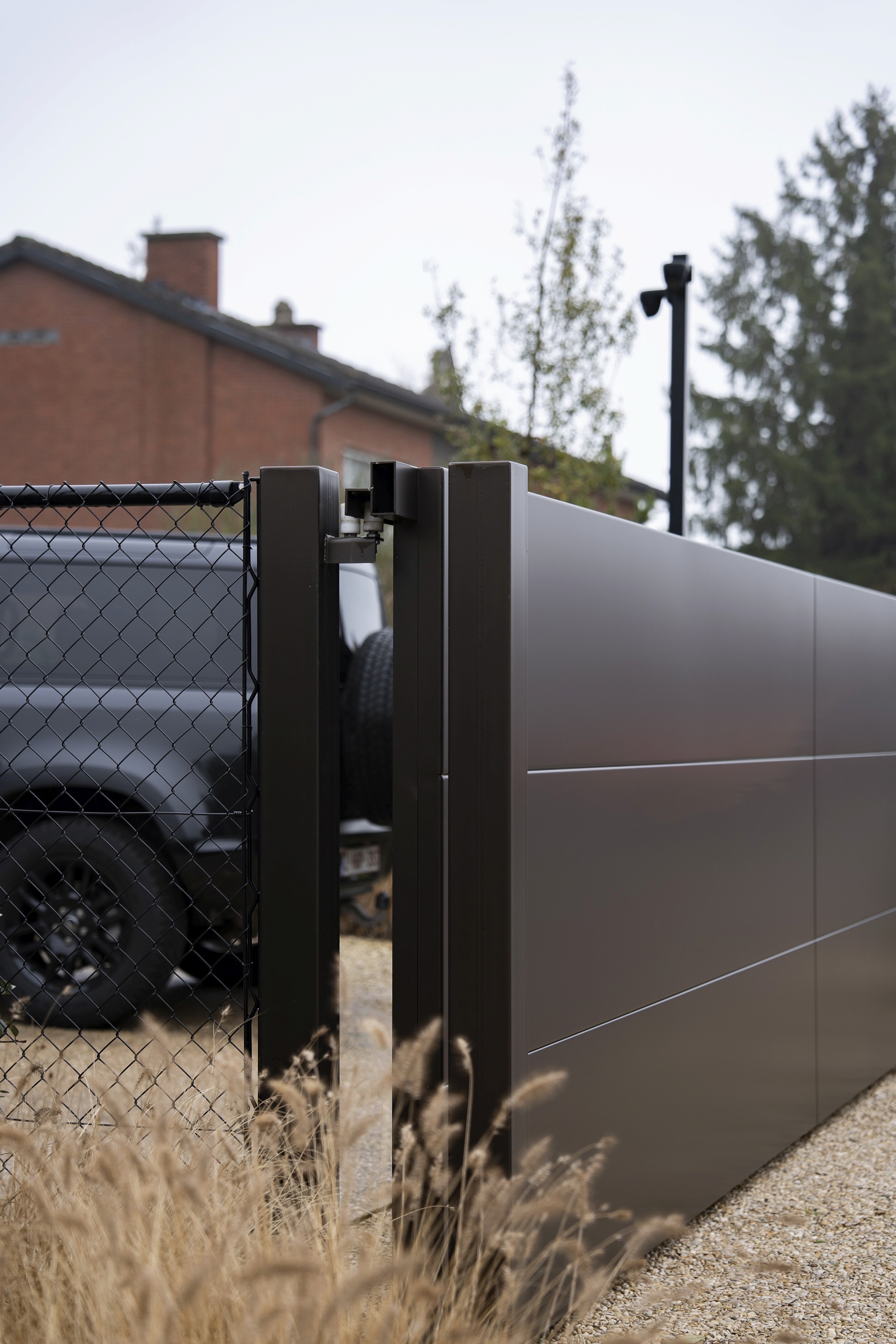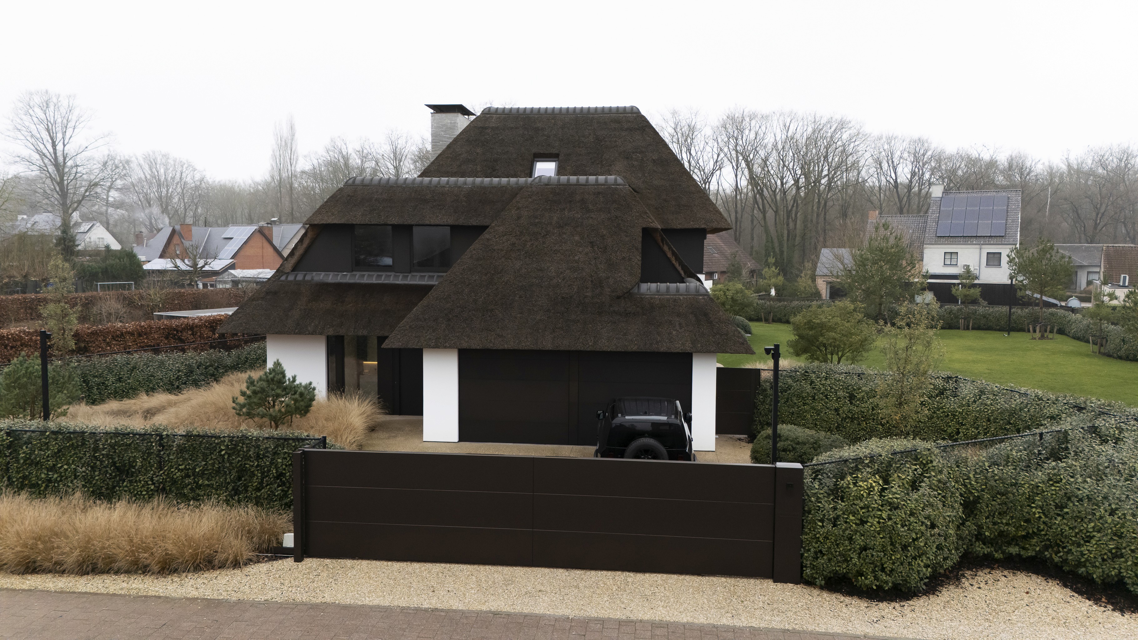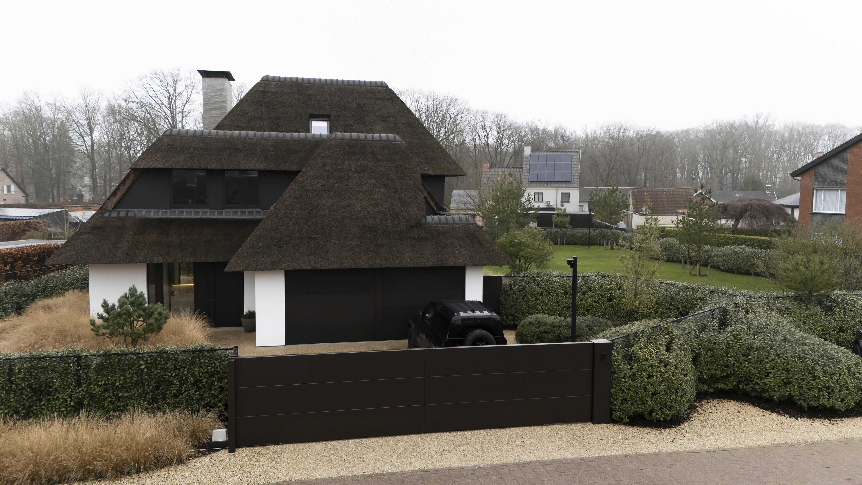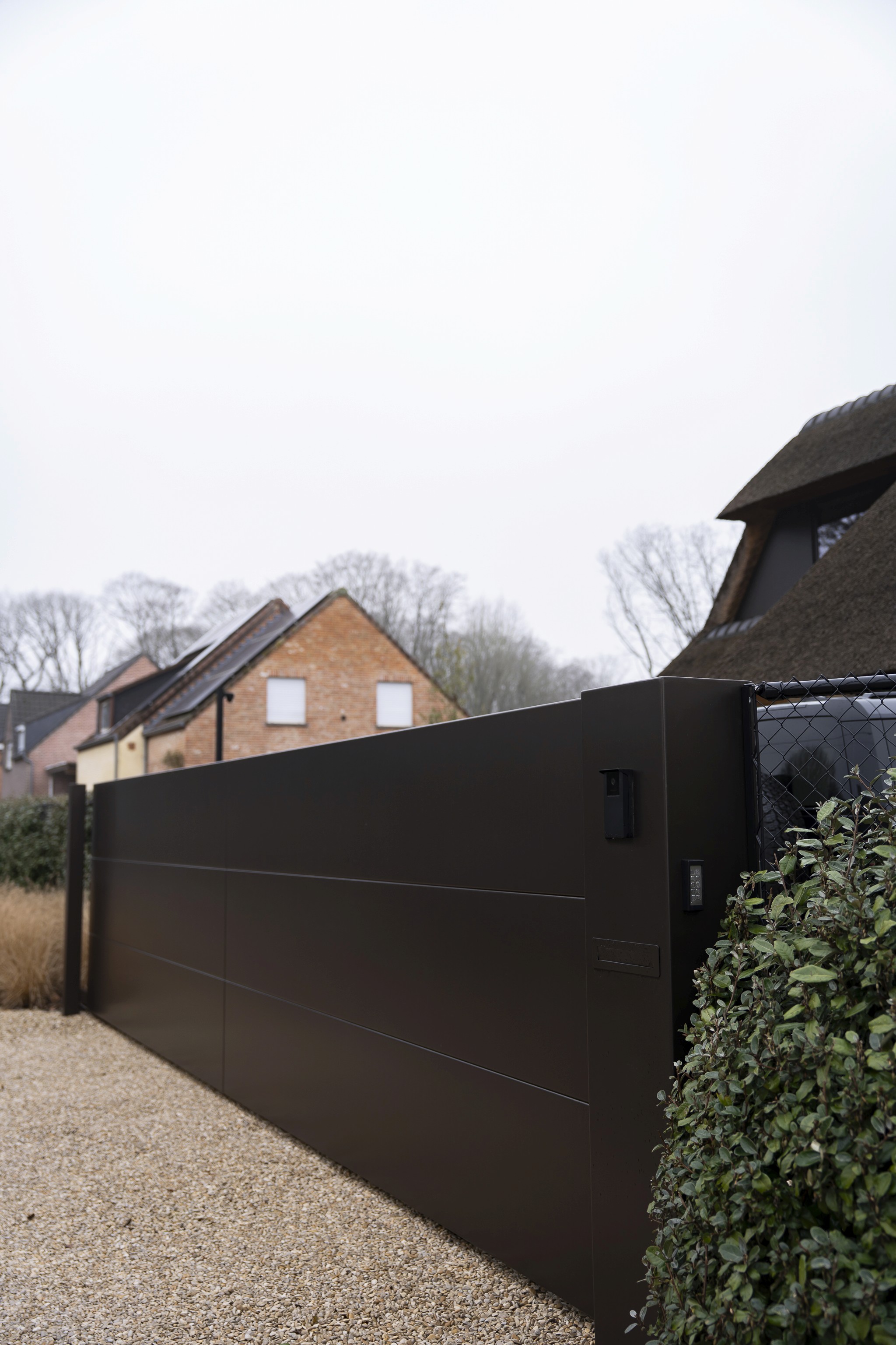 Voor deze hedendaagse woning met rieten dak kozen we voor een volledig gesloten schuifpoort in aluminium. Het strakke lijnenspel en de horizontale belijning zorgen voor rust en een krachtige, sobere uitstraling. De donkerbronzen poedercoating sluit naadloos aan bij de donkere gevelaccenten en het natuurlijke karakter van de woning. Door het minimalistische ontwerp blijft de architectuur van het huis centraal staan, terwijl de poort discreet maar duidelijk aanwezig is.