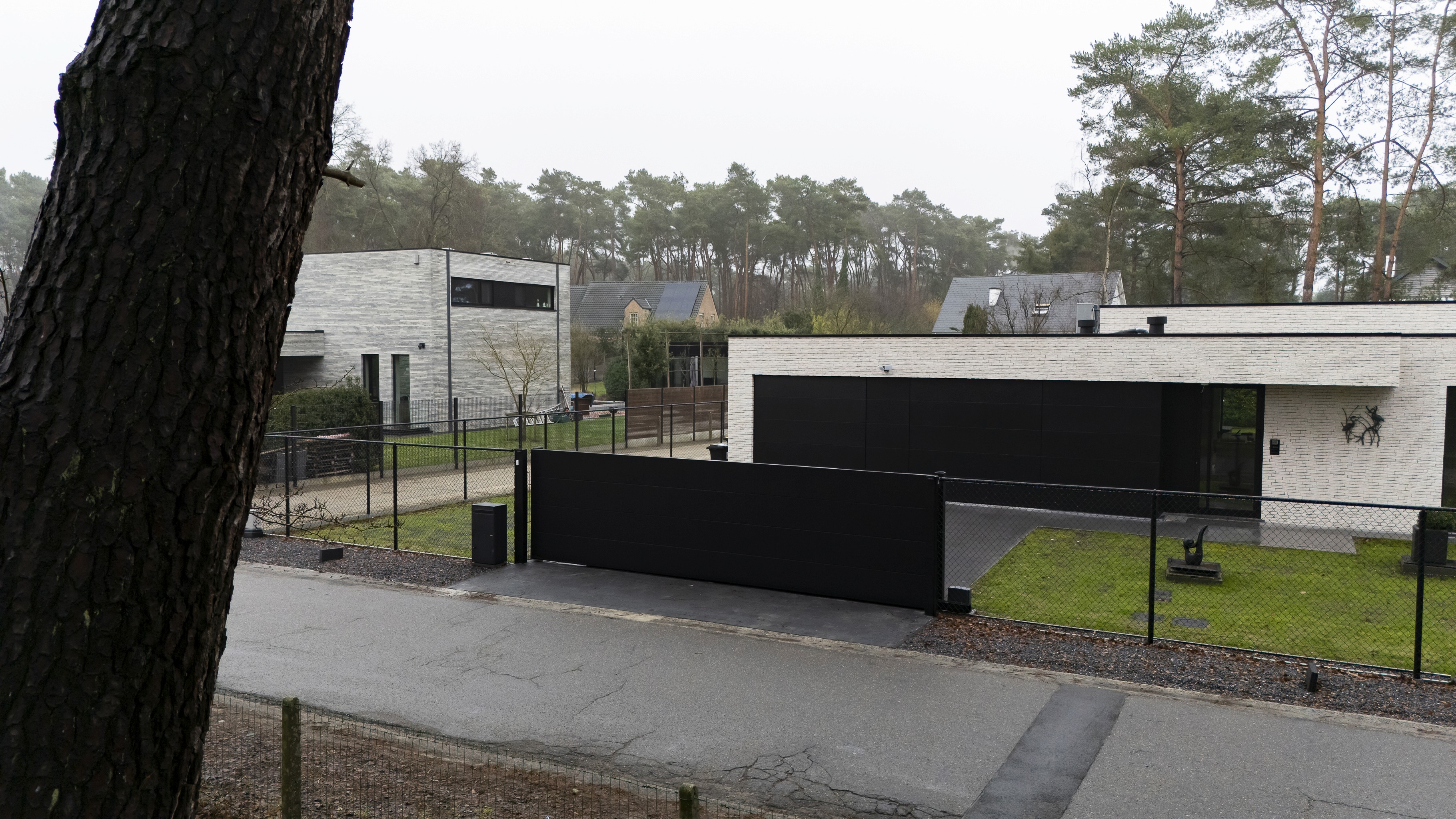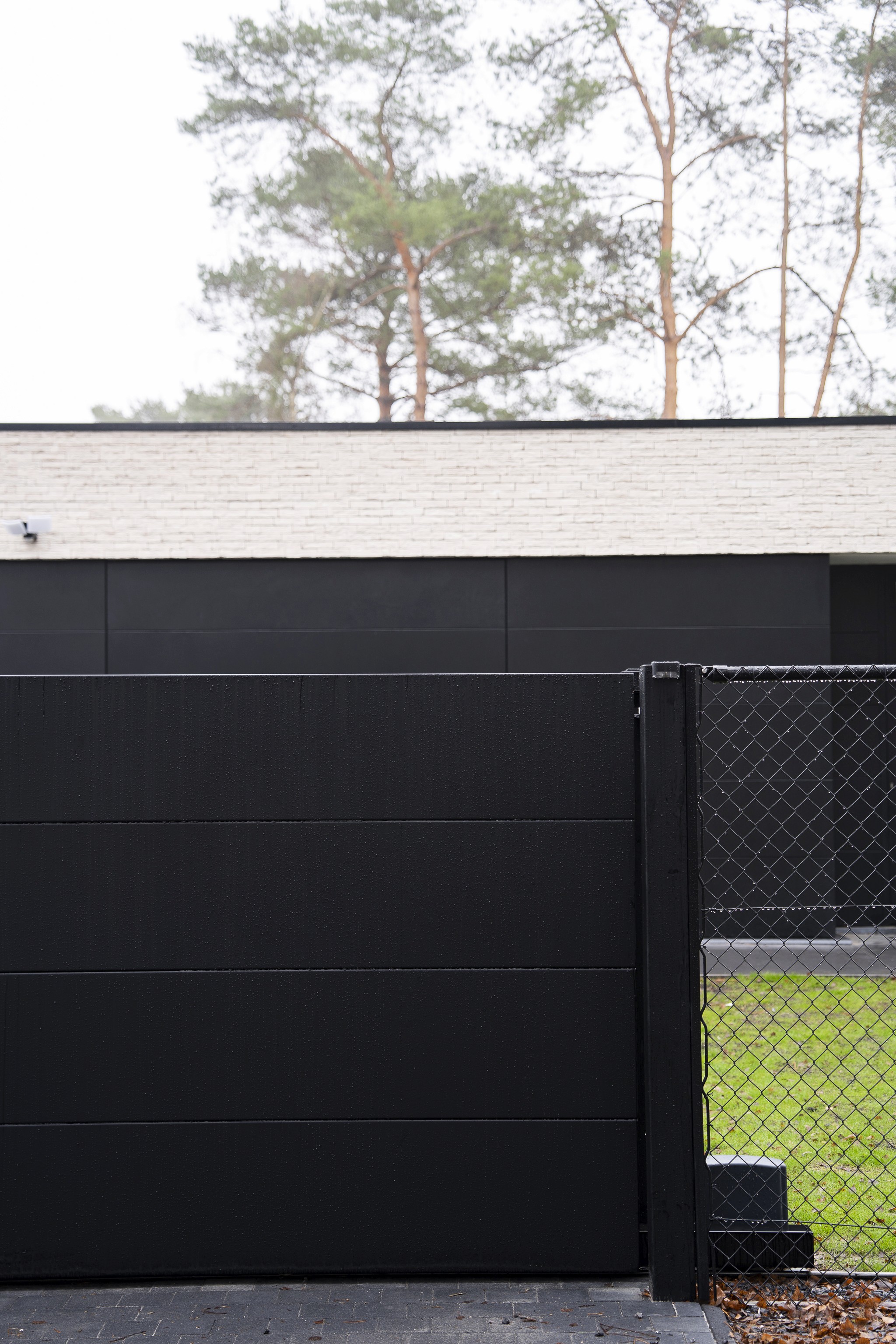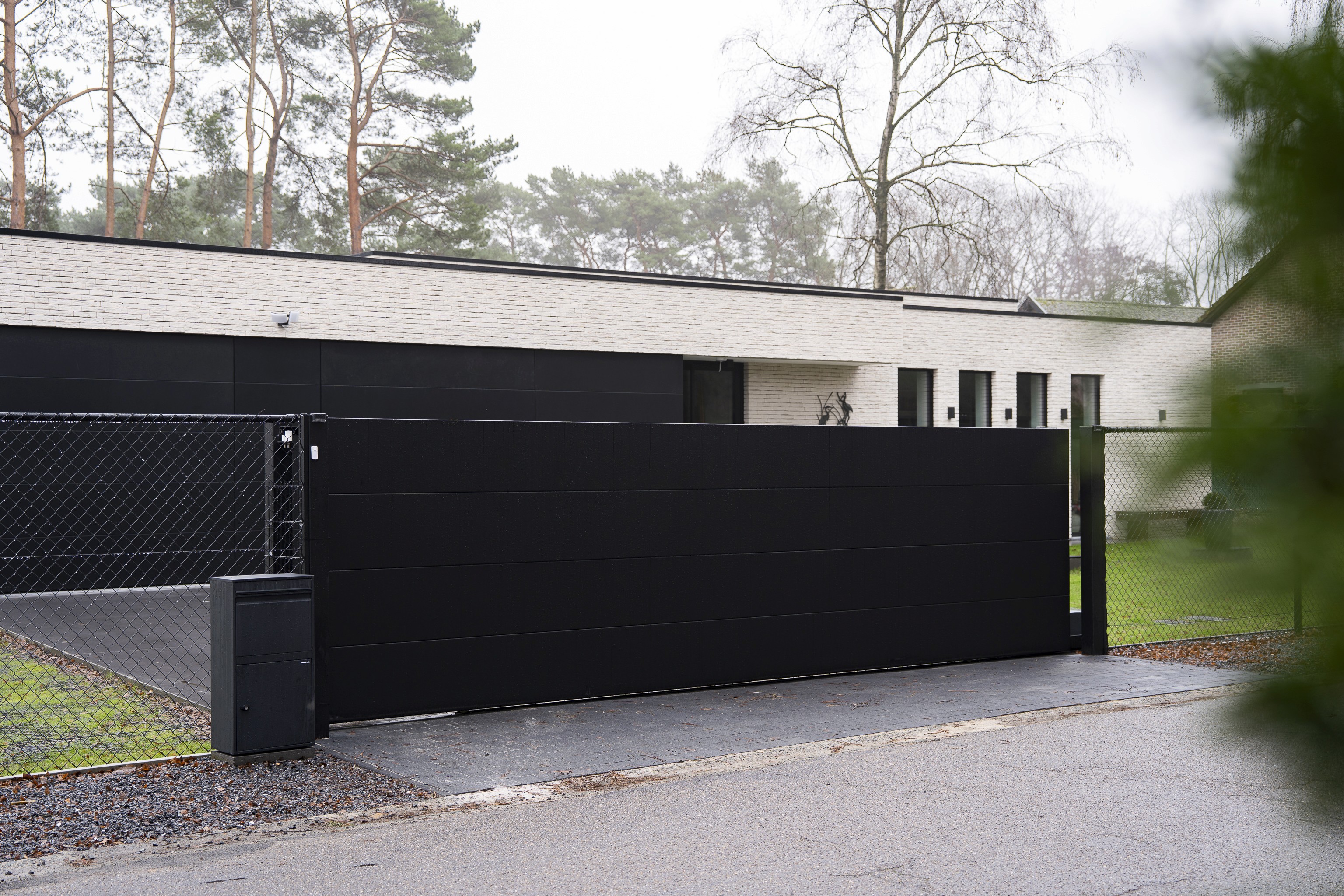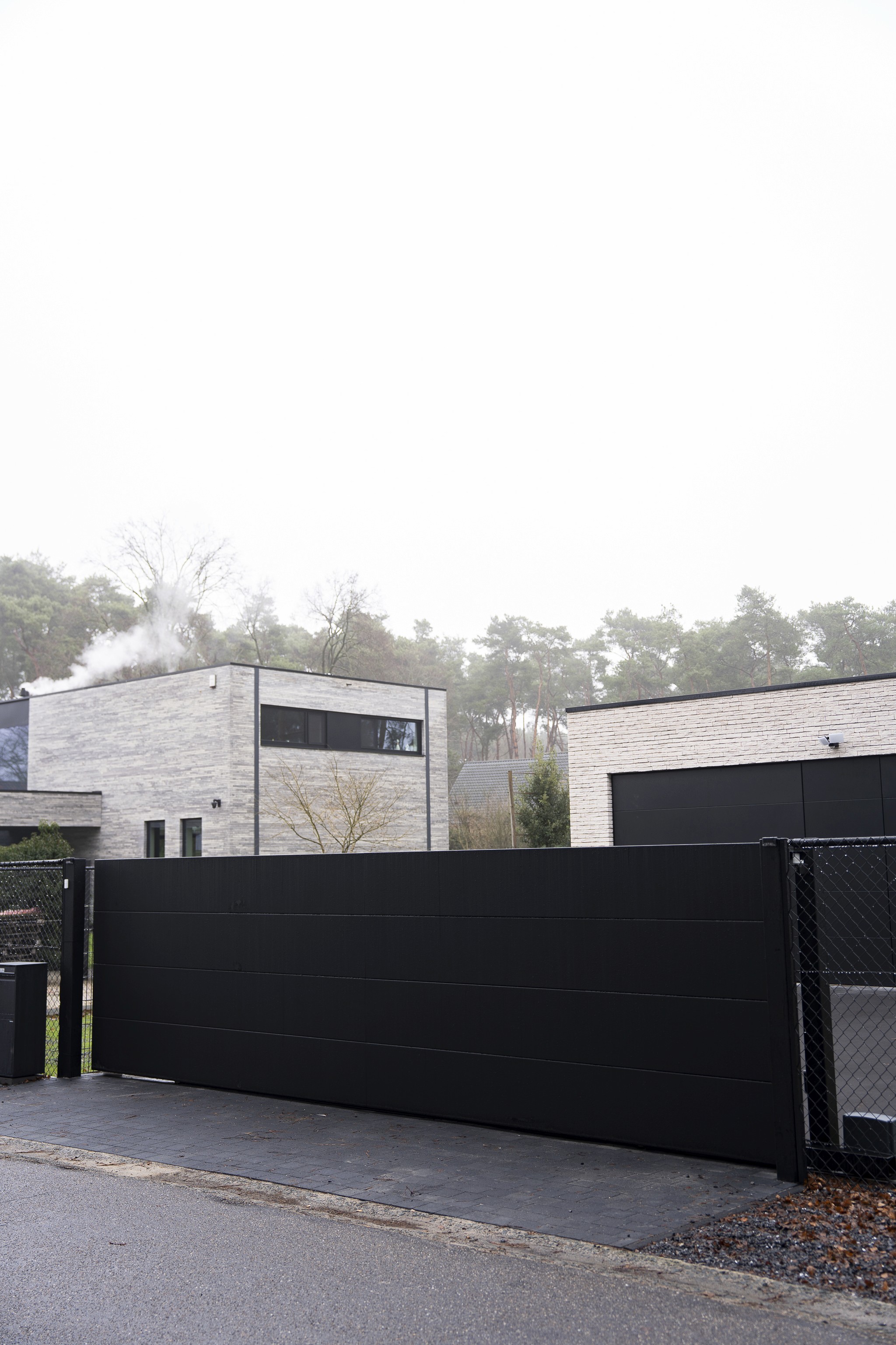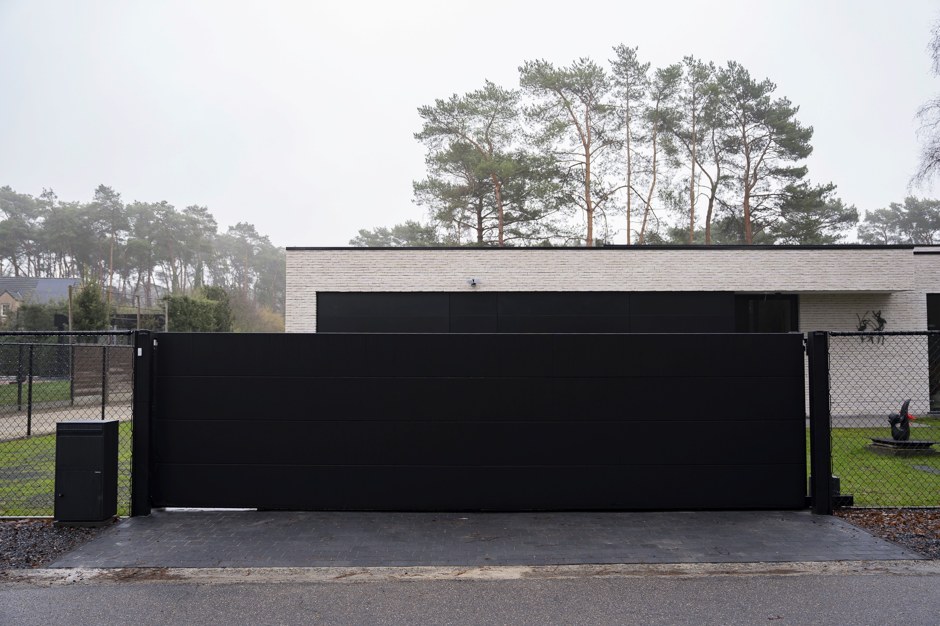 Voor deze moderne woning in een groene, bosrijke omgeving kozen we voor een volledig gesloten schuifpoort in mat zwart aluminium. Het ontwerp sluit naadloos aan bij de strakke architectuur van de woning en de zwarte accenten in de gevel en garagepoort. De horizontale belijning van de poort versterkt het moderne karakter en zorgt tegelijk voor maximale privacy langs de straatzijde. Dankzij de automatische motorisatie opent en sluit de poort vlot en geruisloos, volledig afgestemd op dagelijks gebruik.