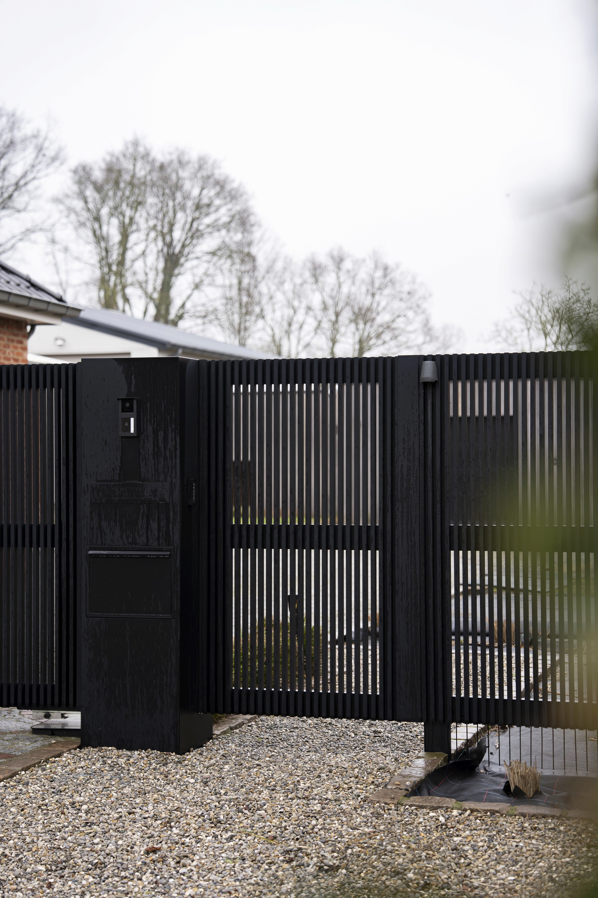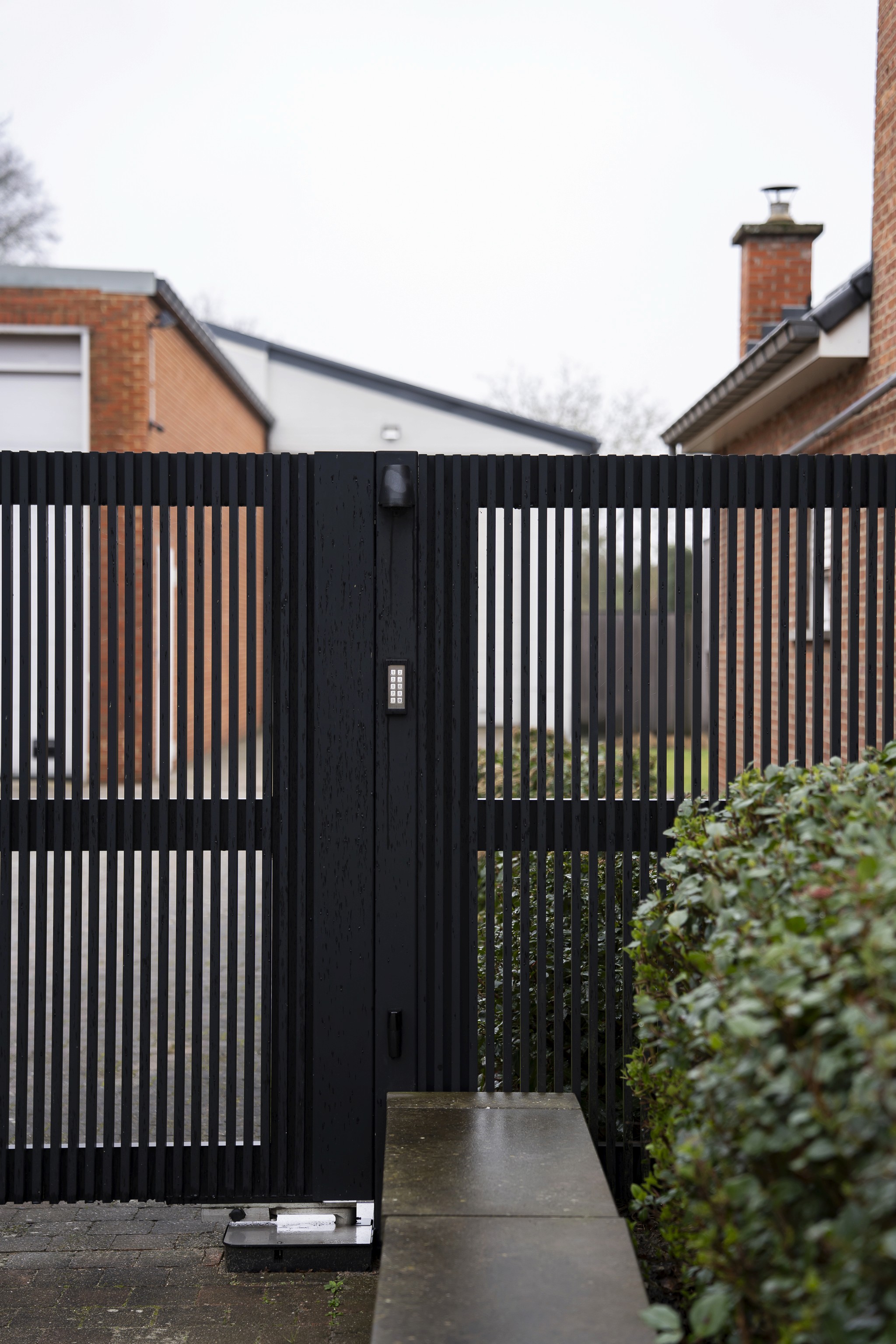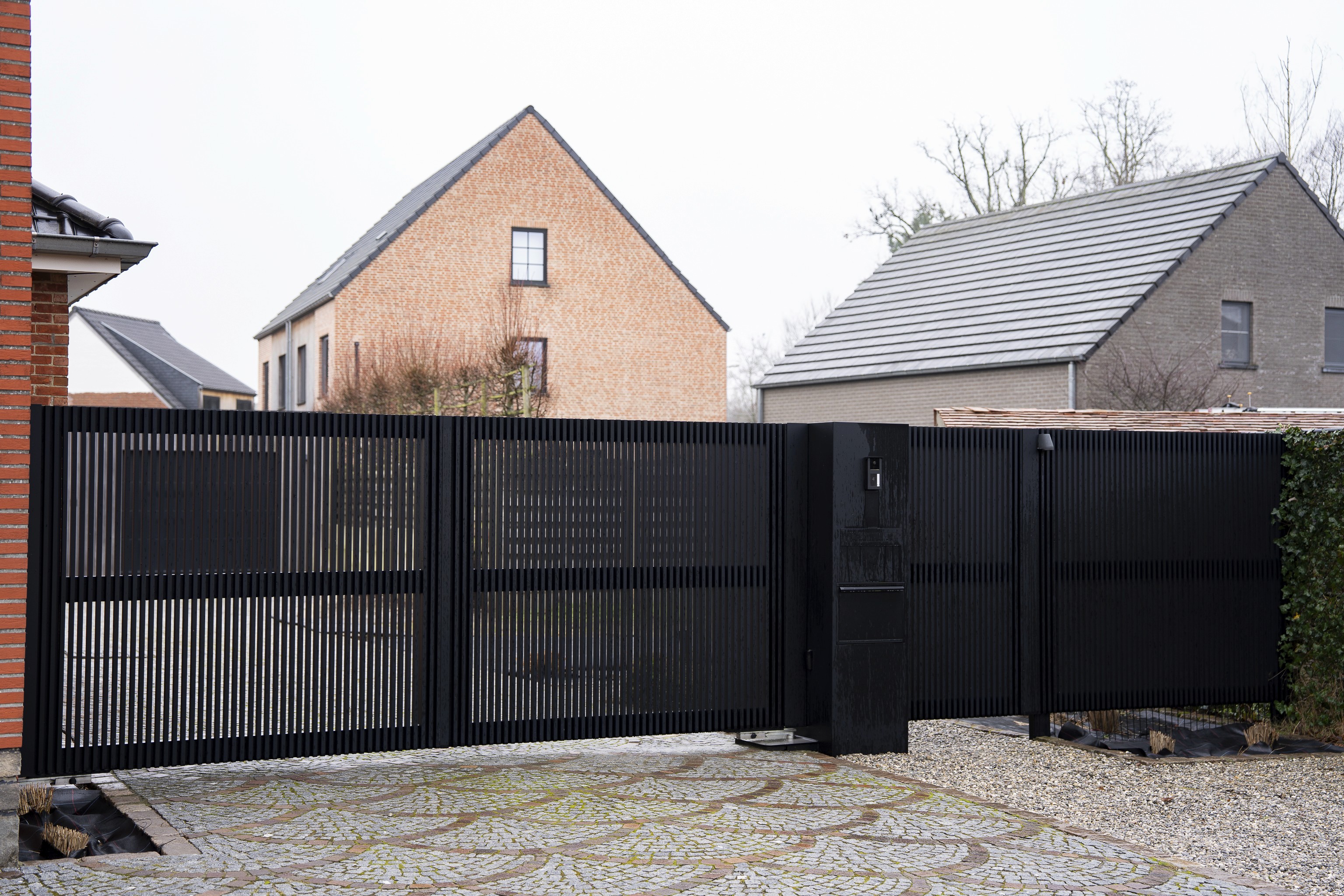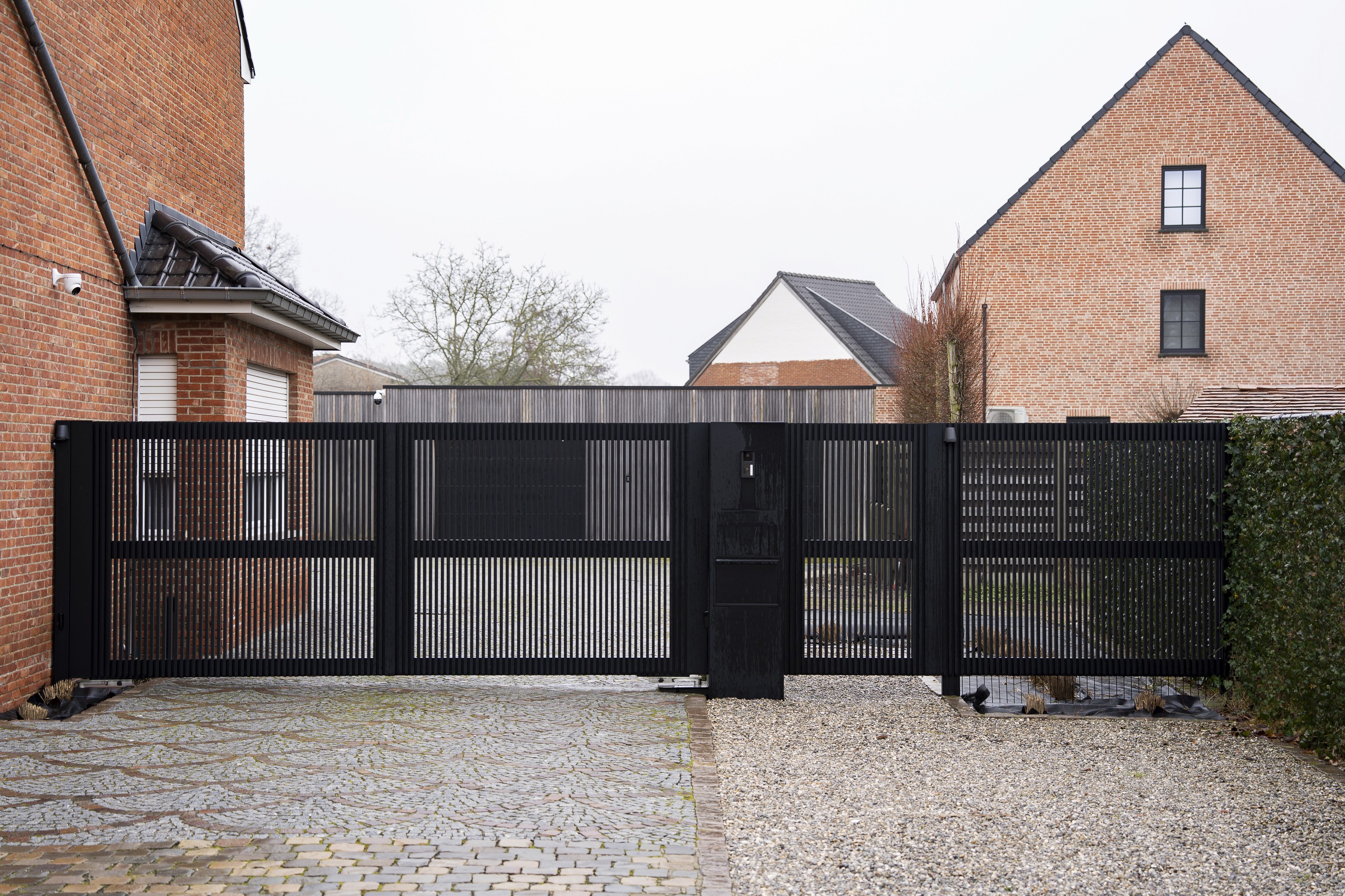 Centraal werd een aparte inkomzuil voorzien met bel, codeklavier en brievenbus geïntegreerd in hetzelfde materiaal en dezelfde afwerking. Alles vormt één coherent geheel, zonder losse toevoegingen. De automatische dubbele vleugelpoort is technisch strak uitgewerkt met een stabiele geleiding en duurzame motorisatie. Het resultaat is een functionele toegang die helder oogt, onderhoudsvriendelijk is en perfect aansluit bij de residentiële omgeving.