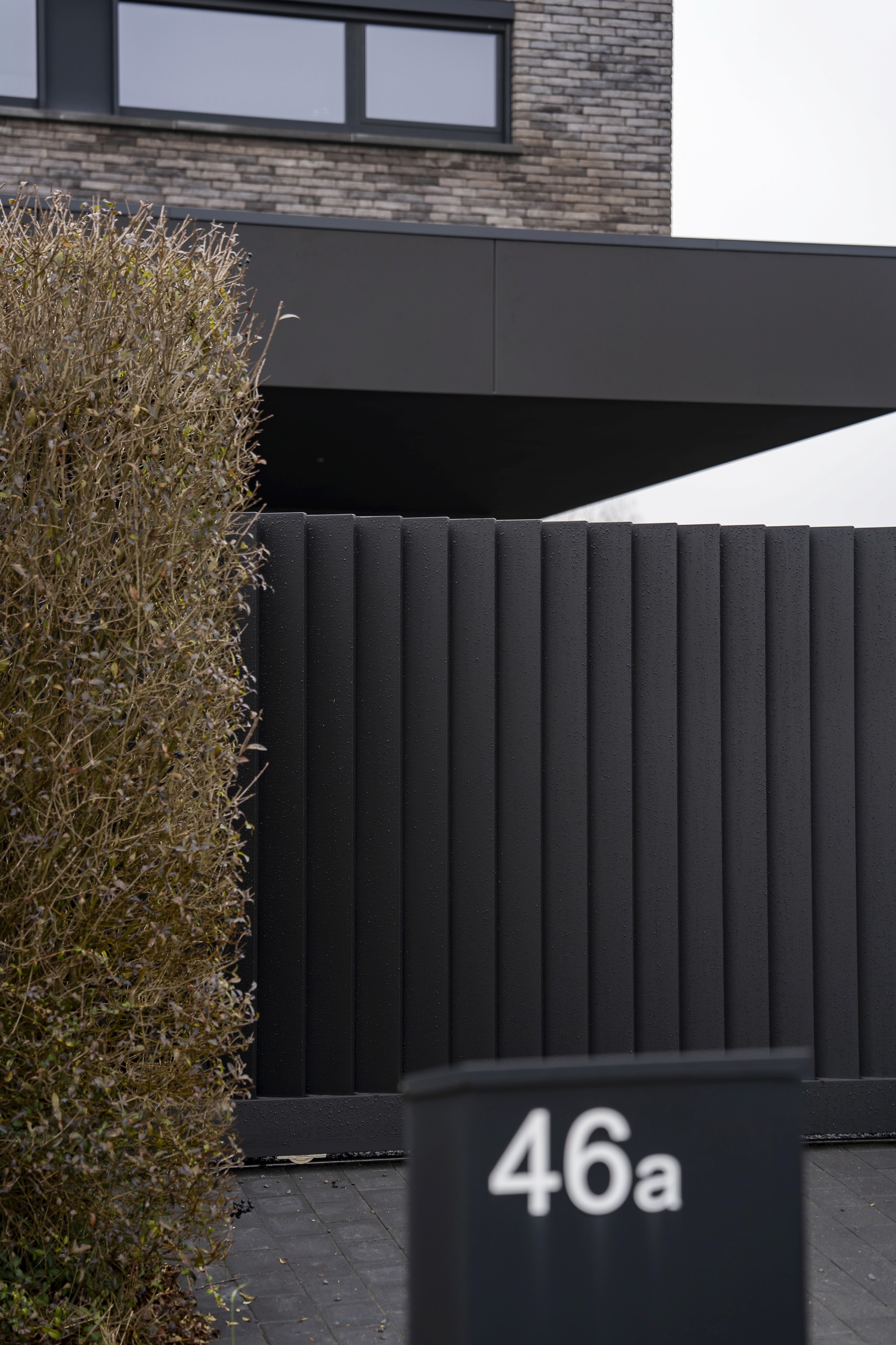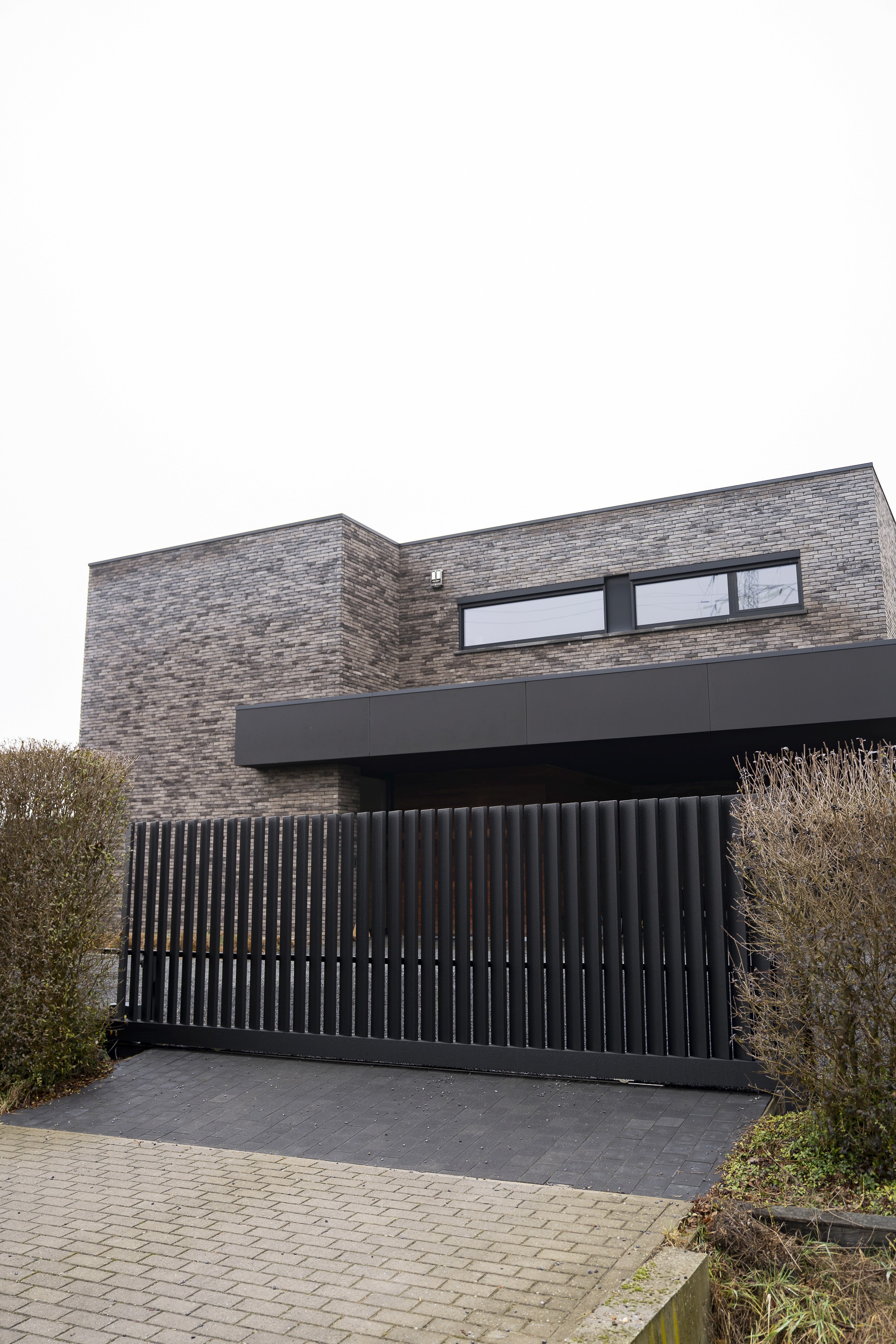 Voor deze moderne woning met donkere gevelsteen realiseerden we een volledig op maat gemaakte schuifpoort in mat zwart aluminium. De verticale lamellen geven het ontwerp ritme en diepte, zonder het geheel massief te maken. De poort sluit perfect aan bij de strakke architectuur van de woning: rechte lijnen, donkere accenten en een minimalistische vormentaal. Tussen de hagen vormt de poort één helder vlak, dat rust brengt aan de straatzijde.