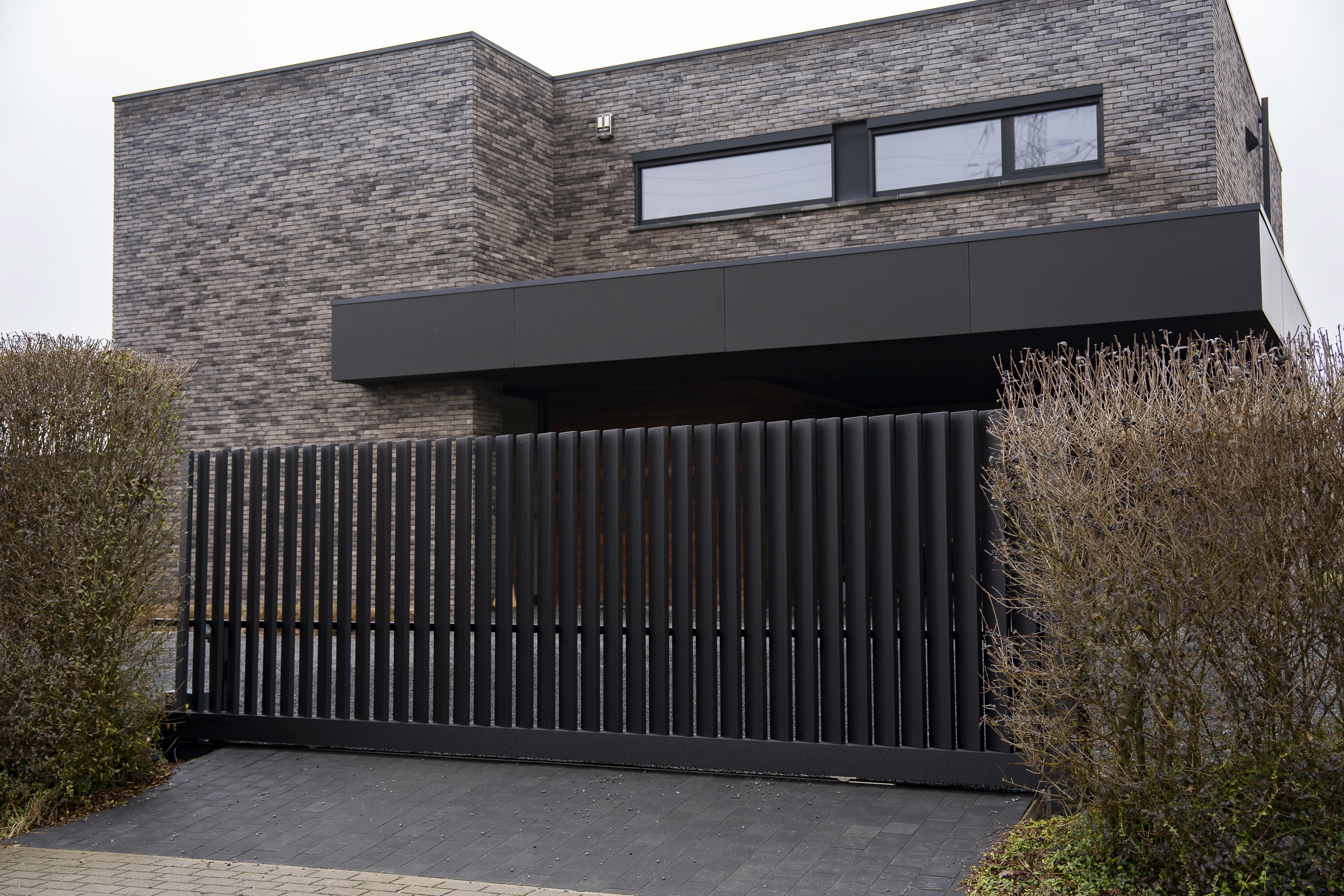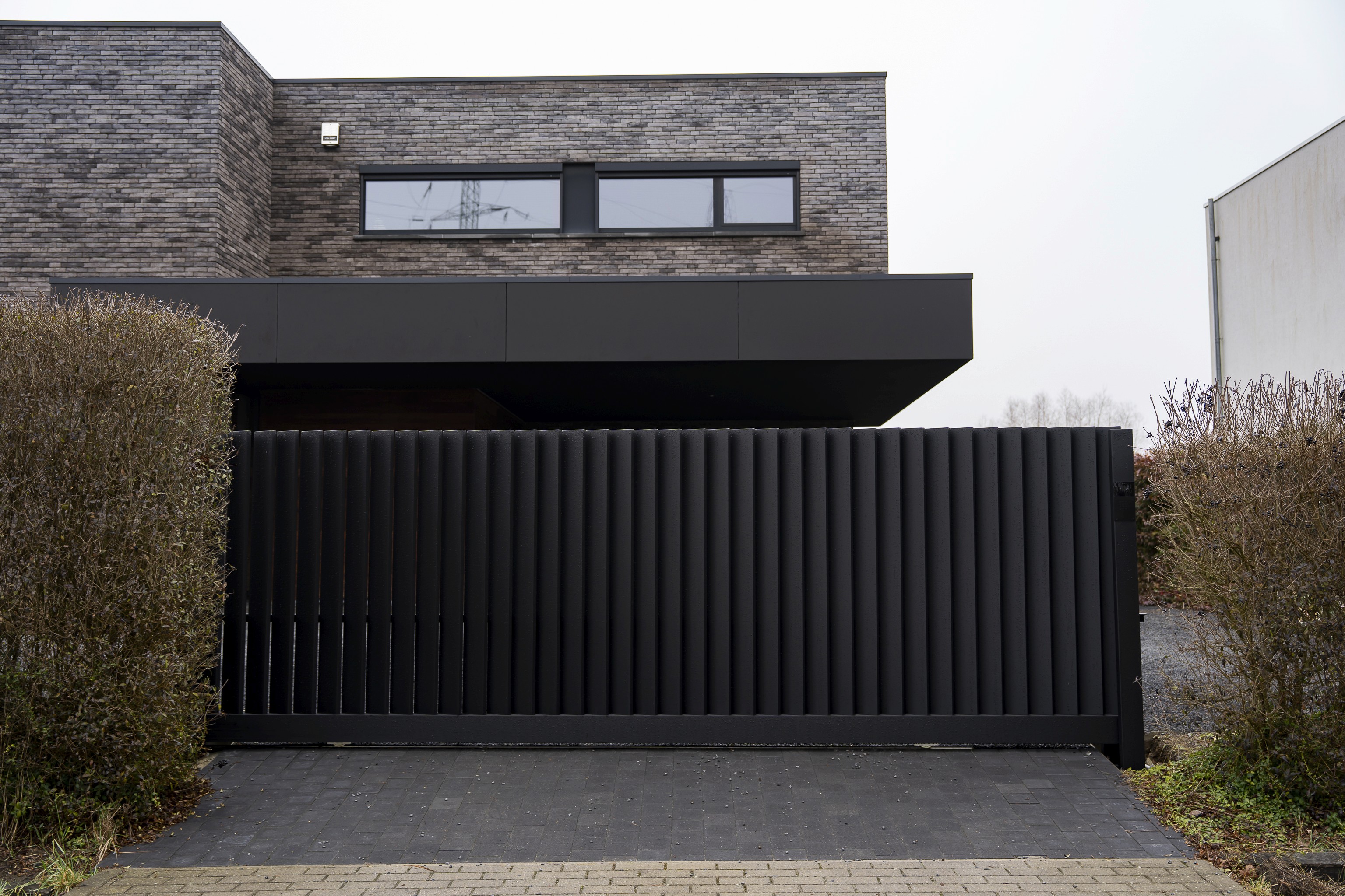 Zwarte schuifpoort met verticale lamellen – Strakke gezinswoning